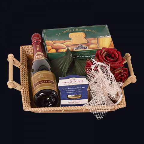 - Crémant Lucien Albrecht Brut, 0,375 l - Kachní rilety Eduard Artzner - Biscuits Fossier Le Sablé Champenois - podnos z tropického dřeva - květinová dekorace